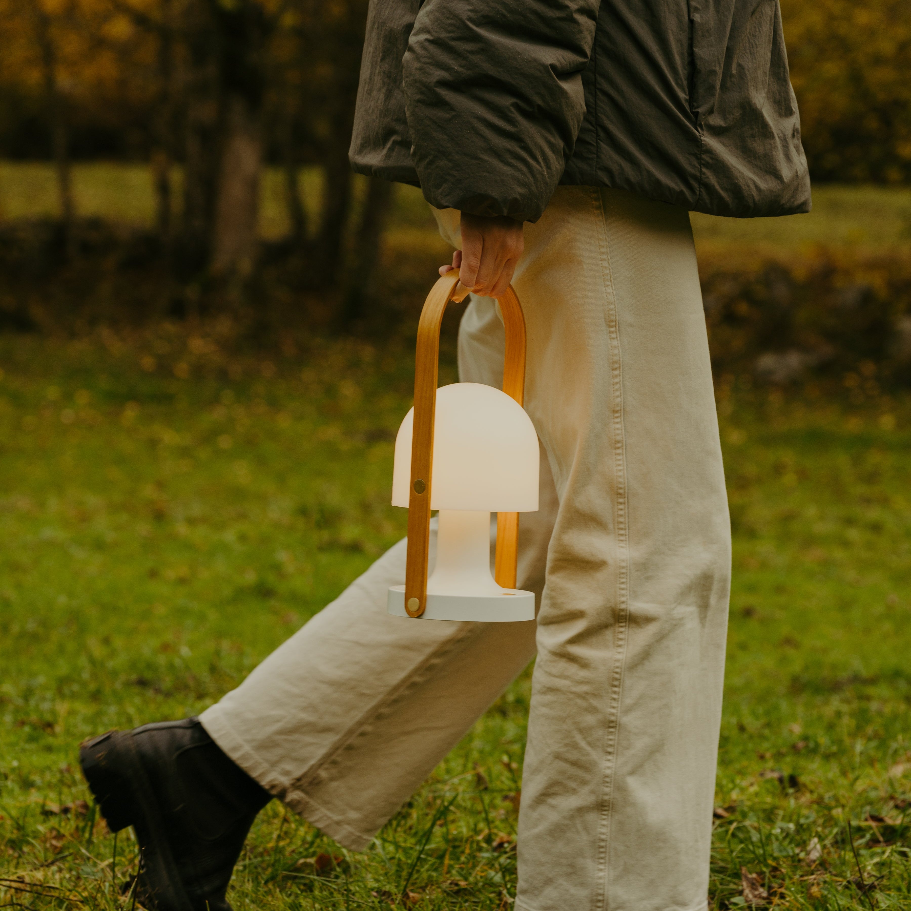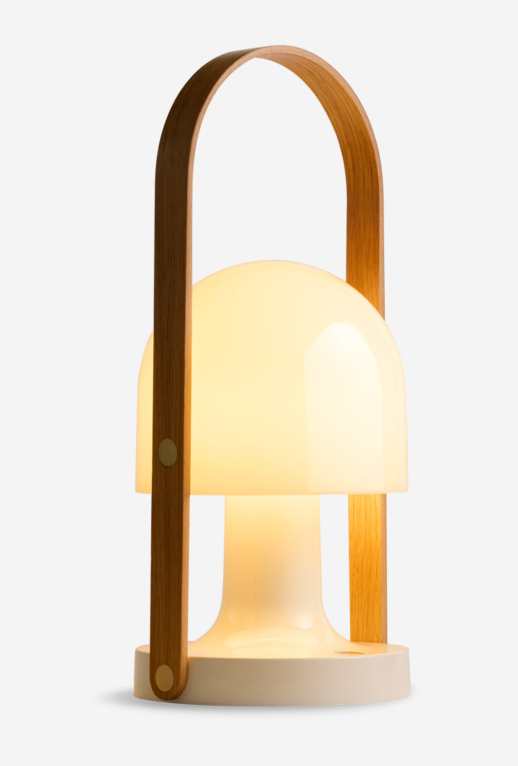 Su carismático diseño con el asa de madera evoluciona y se presenta con un nuevo acabado blanco marfil brillante, y un interruptor en latón que permite ajustar con precisión la intensidad de luz.